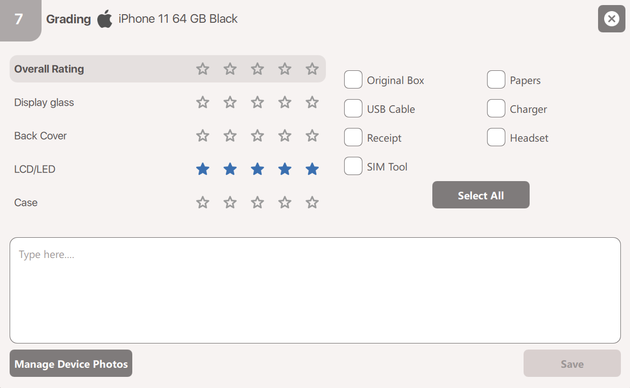 Cosmetic Grading - Use a 1-5 Stars or A-F letters system to grade the Display Glass, Back Cover, LCD/LED, and the Case of the device. You can select an Overall Rating to adjust all values at once, or choose each value individually.