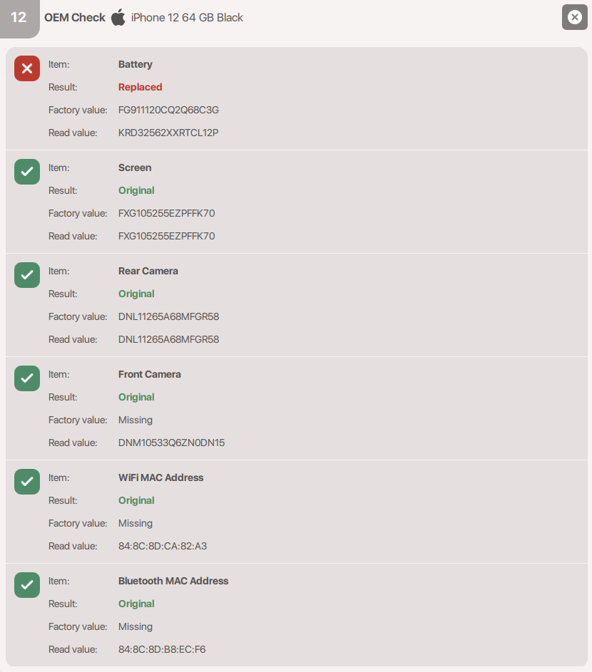 Last updated on Nov 3, 20251 min readThe OEM check is a feature available only for iOS devices, and is used to verify if the components of the device are original or replaced. The OEM will be highlighted as green if all parts are original, but becomes red if at least 1 part is replaced. Opening this menu shows the details of the data checked.