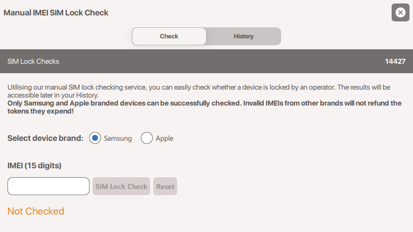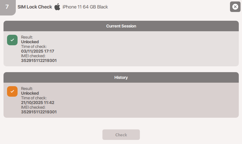 You can also view the history of all SIM Lock Checks performed here, including ones performed from a phonecard.