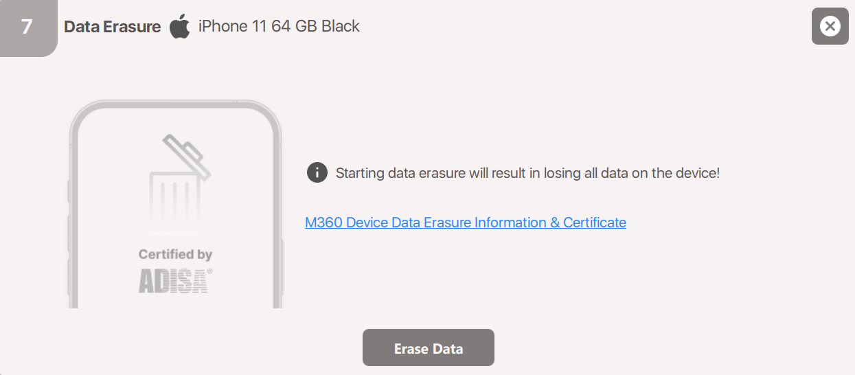 Last updated on Nov 3, 20252 mins readM360 Provides ADISA certified data erasure for Android and iOS devices. This option is available while the device is connected to M360, and has the M360 mobile app installed on it. Generally, this process is as simple as pressing the “Erase Data” button.
