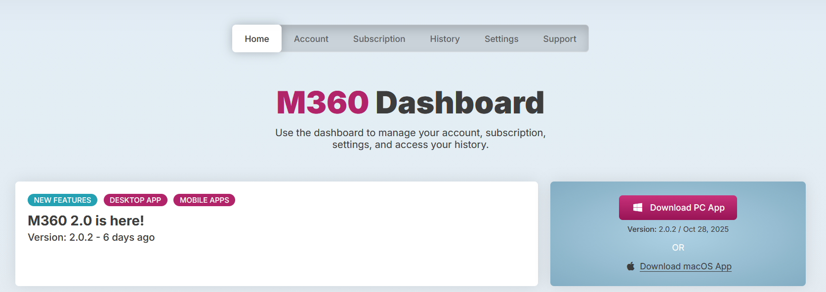 To begin, head over to your Online Dashboard and get the latest version. M360 will always warn you when a new version comes out, and we always recommend downloading it as soon as possible.