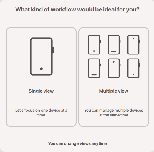 When you open the program for the first time, you will be prompted to choose your preferred workflow of Single View or Multiple View. This simply chooses your initial UI type, and it can be changed anytime with the button in the bottom right of the screen.