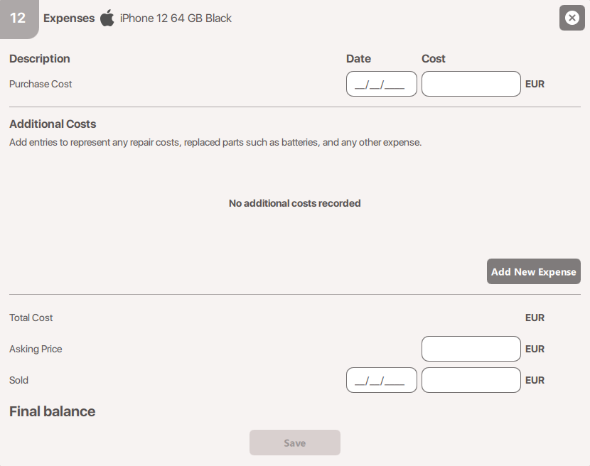 - Eladva: Ez a beviteli mező az eszköz eladása után használható, hogy rögzítsd, mennyiért és mikor adtad el.